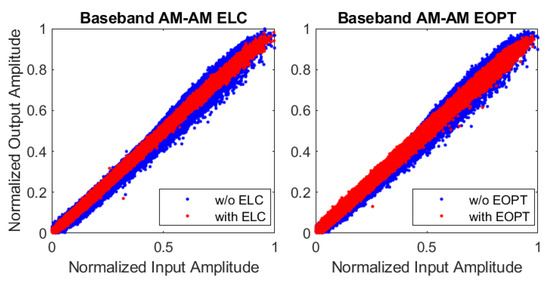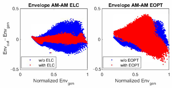 Figure 10 and Figure 11 show the AM–AM characteristics of the ET PA and the ETM with and without ELC and EOPT linearization, respectively. The baseband AM–AM plots are similar to each other since both linearization approaches reached the same level of linearity at the end. The AM–AM characteristic at the ETM relating the generated envelope and the difference between the ETM output and generated envelopes, evidences the difference between the ELC and the EOPT linearization approaches. In both cases, the normalized starts taking values from 0.2 because the OP configuration of the SR envelope is set to 20%. With the ELC linearization approach, the RF leakage is treated as the error to be canceled by using the EGMP model. Consequently, the AM–AM plot after ELC linearization shows the linearization efforts to achieve a constant flat gain. With the EOPT linearization approach, instead, since the ETM output is not available, canceling the RF leakage is not the objective. As observed in the AM–AM plot in Figure 11-right, the RF leakage is not compensated at the ETM output () after EOPT linearization; instead, as it will be shown later, the resulting supply envelope is optimized for linearity at the ET PA output.