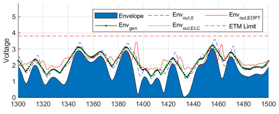 Time domain plots of different supply envelopes are depicted in Figure 12. As observed, , which is the envelope at the ETM output when no linearization is applied, contains high-frequency leakage in comparison to the generated envelope . Most of the RF leakage can be compensated with the ELC linearization approach, as observed in in Figure 12. Instead, (i.e., the supply envelope after EOPT linearization) does not show any RF leakage compensation. However, the resulting supply envelope after EOPT linearization is optimized for linearity at the ET PA output. In any case, neither nor envelopes exceed the ETM’s linear amplification limitation (around 3.8 V).