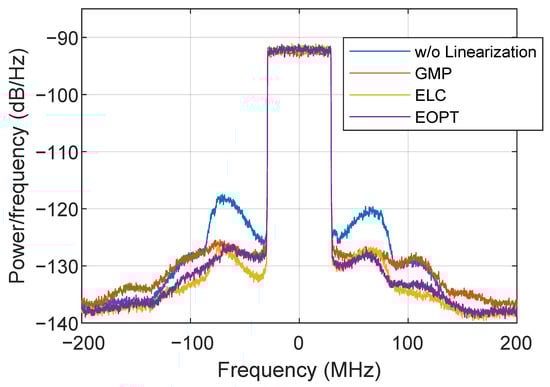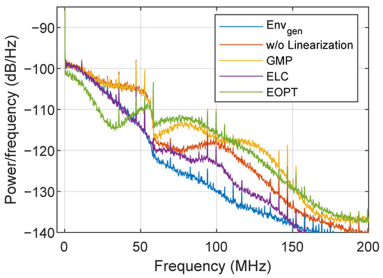 Figure 13 shows the spectra of different supply envelopes before and after applying different linearization methods. By considering a vertical margin of 40 dB, the generated SR envelope () has around 100 MHz bandwidth. The supply envelope at the ETM output without linearization has around 140 MHz bandwidth, i.e., the RF leakage has a bandwidth of around 140 MHz. Consequently, both the ELC or EOPT linearization approaches will generate an envelope optimization signal mostly within this bandwidth. After applying GMP-based I-Q DPD, the ETM output spectrum shows a spectral regrowth above 60 MHz. Despite the fact that the GMP-based I-Q DPD generates an I-Q predistorted signal targeting the linearization of the ET PA, part of the linearized RF signal is leaked to the ETM output and combined with the supply envelope, degrading again the linearity at the ET PA output. After ELC linearization, the spectrum of the ETM output is very close to the spectrum of the generated envelope , although there are some variations from 60 to 150 MHz. As observed, the purpose of EOPT linearization is not canceling the RF leakage, since the spectrum of the ETM output does not resemble the generated envelope. However, as shown in Figure 14, thanks to the EOPT linearization, the linearity requirements are met at the ET PA output.