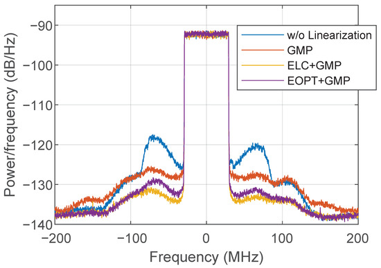 Figure 14 presents several ET PA output spectra when considering different linearization approaches. Without applying any linearization, the output spectrum shows strong leakage at its adjacent channels, with a significant spectral regrowth at around 60 MHz away from the center frequency. This specific spectral regrowth can be somehow compensated by the GMP-based I-Q DPD (including cross memory and high-order terms). However, as shown in Figure 14, the ET PA output spectra after GMP-based I-Q DPD fails to further compensate for the distortion at higher frequencies. Instead, when considering the linearization approaches at the supply envelope path (i.e., the ELC or EOPT), the overall spectral regrowth is mitigated, despite the fact that the peaks appearing at 60 MHz can still be appreciated. Although both envelope linearization approaches are enough to meet the linearity specifications (i.e., ACPR 36 dBc), to further improve the overall ET PA linearity, these can be combined with the conventional I-Q DPD linearization. Figure 15 shows ET PA output spectra when both ELC and EOPT envelope linearization techniques are combined with GMP-based I-Q DPD (i.e., ELC+GMP and EOPT+GMP, respectively).