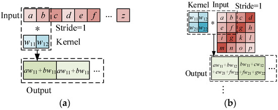 where in Equation (1), x is the 1-D input, v is the convolutional kernel and o is the output. Similarly, in Equation (2), X is the input of the 2-D convolutional operation, and V and O are the corresponding kernel and output. The strides of convolutional operation, s, refers to how many data points are skipped between the two operations. The process of 1-D and 2-D convolution is expressed in Figure 1.