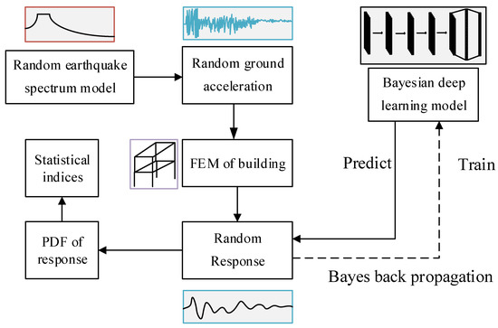 The framework of the proposed method is presented in Figure 3. A finite element model of a 3D building with random characteristics is built. Through Monte-Carlo simulation, samples of input ground motion acceleration and output structural response are generated. The training data are utilized to train the deep convolutional neural network through Bayes back propagation algorithm. The trained Bayesian deep learning model is used to predict the random response of the 3D building. The results are given in the form of probability distribution functions (PDFs) and the main statistical indices are expressed as mean value and standard deviation.