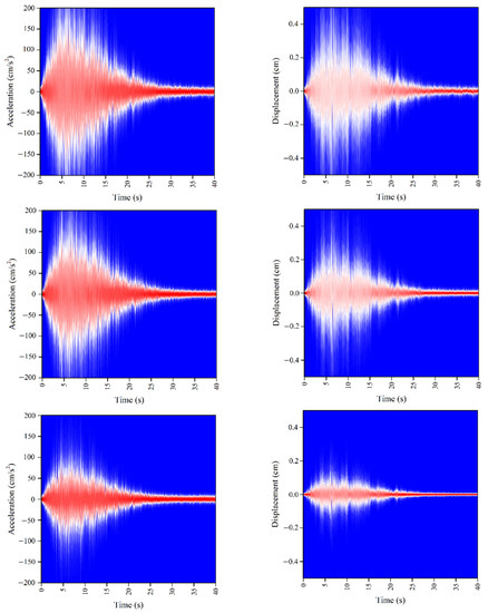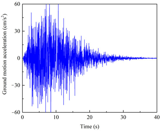 The 3D building is considered to be located in a 2nd class site and the design earthquake group belongs to group 2. According to the Chinese code for seismic design of buildings and related literature [46,47], the parameters and are selected as ωg = 15.7 rad/s and ςg = 0.72. A frequent earthquake with intensity of VII is considered. Therefore, the spectral intensity of the stationary white noise process S0 is equal to 15.21 cm2/s3. The parameters of amplitude envelope function are given as: , and tn = 40 s. Figure 5 presents a sample generated by the GKT model.