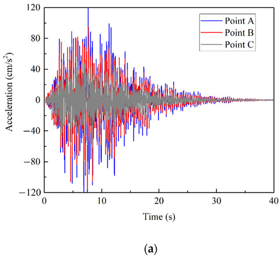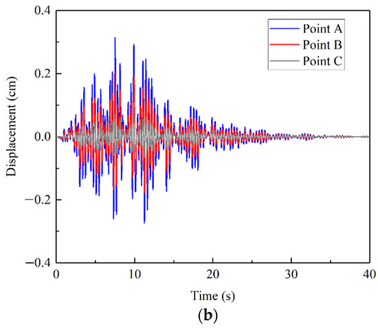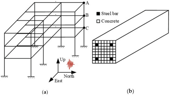 The 3D building is modeled by OpenSees [46] for further analysis. The analytic model in OpenSees can be described as in Figure 6. Every column and beam in the building is modeled through fiber approach [47]. Each fiber in the column or beam section can be assigned as a concrete or steel bar in order to simulate their combined action. The earthquake wave is applied in the direction of North to South (NS). The displacement and acceleration response of point A to C (as shown in Figure 6) is presented in Figure 7.