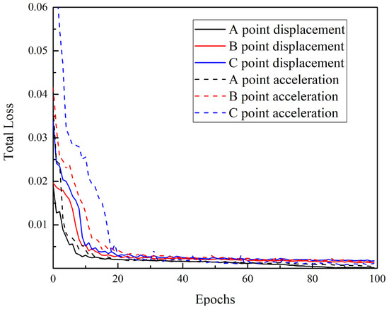 To validate the random response prediction capacity of the proposed Bayesian deep learning model, 1000 samples were generated by 3D building FE model through Monte-Carlo simulation. Out of these samples, 500 were utilized for model training while the rest were used for validation and analysis. Bayes back propagation algorithm and RMSprop algorithm were used to train the proposed Bayesian deep learning model and the initial learning rate was equal to 0.0001. The training process is presented in Figure 8 which describes the loss function, varied with training epochs. As shown, the total losses of Bayesian deep learning were reduced during modeling and after 80 epochs; the total losses arrived at the level of 10−4. This means the proposed model can be well trained by using the back propagation algorithm.