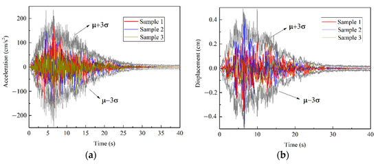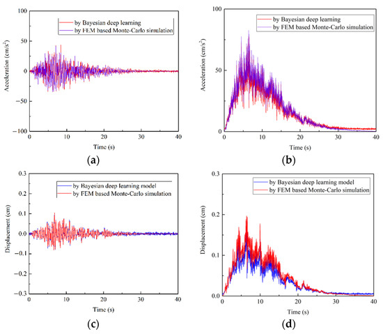 The response prediction results are provided in the form of PDF, illustrated in Figure 9. Since the shapes of time history response curvatures at A, B and C points were similar, we only discuss the response at point A as our example. As shown in Figure 10, the samples of random response can be included in the section of [μ − 3σ, μ + 3σ], where μ is the mean value of response and σ is the standard deviation at point A. This result coincides with the conclusion of Gaussian distribution in probability theory. Figure 11 further compares the difference between Bayesian deep learning prediction results and Monte-Carlo simulation results in the mean value and standard deviation. The PDF of prediction result was close to the PDF from FEM based Monte-Carlo simulation. The normalized mean square errors (MSEs) of mean value were 1.92 × 10−5 (acceleration) and 5.05 × 10−5 (displacement), while the normalized MSEs of standard deviation were 1.17 × 10−4 (acceleration) and 5.10 × 10−4 (displacement). The peak errors of mean value were 2.56% and 5.99%, while the standard deviations were 5.34% and 10.23%. It was found that the prediction results of acceleration response had higher accuracy. This might be due to the weaker correlation between ground motion acceleration and structural displacement response.