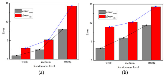 The comparison of peak error under different randomness level: (a) acceleration response; (b) displacement response.