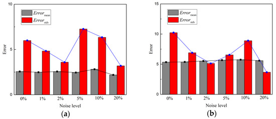 The comparison of peak errors under different noise levels: (a) acceleration response; (b) displacement response.