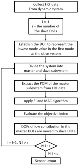 The proper orthogonal decomposition (POD) method has been widely used in engineering fields. It is utilized to decompose structural responses into a set of spatial functions, in a similar manner to principal component analysis and singular value decomposition. The sensors are placed in locations where energy is relatively concentrated. Kerschen et al. [16] studied the POD to extract the order reduction and the feature extraction modes. Nimityongskul and Kammer [17] developed an OSP technique based on frequency response data in the mid-frequency range using principal component analysis. They mentioned that the optimal sensors are at positions that represent the independence and the signal strength of the dominant principal directions. Cherng [18] proposed methods to predict modal parameter identification, such as natural frequencies, mode shapes, and damping ratios based on the singular value decomposition method. The goal of this paper is to present OSP techniques based on MAC and EI approaches using POMs extracted from measured FRFs. The approaches are iterative methods that reduce the number of candidate sensor locations and the system order, as shown in Figure 1. The dynamic system order is reduced using modal coordinates in order to apply the generalized inverse relationship between master and slave mode shapes. Evaluating the MAC values and the EI indices at each iteration, the low-contributing objective function master sensor DOFs are deleted and moved to the slave DOFs. The iteration proceeds until the prescribed sensor number coincides with the master DOFs. The validity of the proposed method is illustrated in designing the optimal sensor layout on a truss structure. It is shown that the FRF-based OSP methods proposed in this study reflect dynamic characteristics within a wide range of frequencies. The example compares the final sensor layouts between the MAC and the EI techniques, and it analyzes their inconsistency.