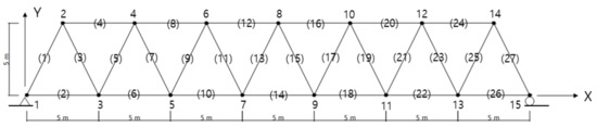 The MAC and the EI methods proposed in this study are utilized in a truss structure presented by Sun and Buyukozturk [19]. The numerical results and the sensor layouts were compared by tracing the candidate locations during the numerical iteration. The plane truss structure, as shown in Figure 2, consisted of 27 members and 15 nodes. The structure was simply supported at both ends. Each node had two DOFs of horizontal and vertical displacement and a total of 27 displacement DOFs, except for boundary conditions. The material properties of the truss member were selected as follows: elastic modulus and mass density . The elements 1, 2, 4, 6, 8, 10, 12, 14, 16, 18, 20, 22, 24, 26, and 27 had a cross-sectional area of , and the elements 3, 5, 7, 9, 11, 13, 15, 17, 19, 21, 23, and 25 had a cross-sectional area of .