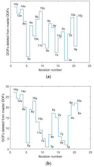 Figure 4 compares the DOFs removed from the master DOFs in each iteration by the MAC and the EI methods. The same DOFs were removed from the master DOFs until the initial fifth iteration, as shown in the figure. After that, it can be seen that the path of the removed DOFs was different, and it gradually converged to the independent DOFs. Since both methods evaluate the degree of the contribution to the linear independence and design of the optimal sensor, a small difference in the sensor layout between the two approaches was due to the established objective function. The optimal measurement positions obtained in this study are compared in Figure 5. When comparing the results of the two approaches, the DOF 13x was consistent. Considering the geometrical symmetry except for the boundary conditions, the DOFs 3y, 5y, and 7y in the MAC-based approach can be seen to correspond to the DOFs 13y, 11y, and 9y in the EI-based approach, respectively. The DOFs 4x and 11y in the MAC-based approach were located at the nodes adjacent to the DOFs 2x and 12y in the EI-based approach, respectively. Figure 5c shows the OSPs obtained from the example provided by Sun & Buyukozturk. This example estimated the positions of eight sensors. Compared with the results of this study, two OSP algorithms in this study exhibited the same sensor positions in four DOFs. This difference in the OSPs is interpreted to be due to the difference in the algorithm, including the location of the objective function.