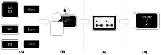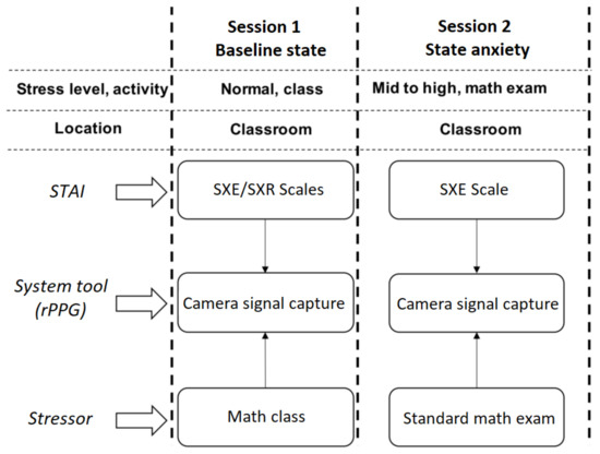 Recurrent testing provided data on anxiety trend (SXR) and state anxiety (SXE) in different potentially stressful academic scenarios. In addition, rPPG was used to obtain the heart rate from a video source. Consequently, when the STAI scales were complete, the students’ faces were also recorded.