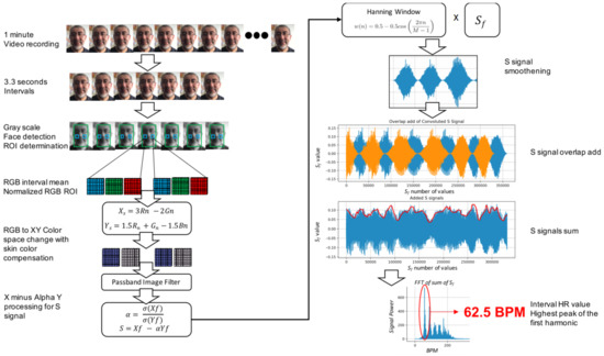Finally, Fast Fourier Transform was applied to the resultant Sf signal in order to calculate the highest peak of the first harmonic, which contains the actual HR value of the actual window. Figure 2 illustrates the procedure.