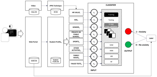 The demographic data and the HR values of each student were mapped to the predictive label anxiety class, which was based on the results of the SXE scale. The cutoff scores of the SXE scale were set as a score of more than 43.01 for males and 43.69 for females. These were labeled as high academic stress (1); otherwise, the label was low academic stress (0). Figure 3 shows how these features were obtained and how the classifier predicted the label class for anxiety.