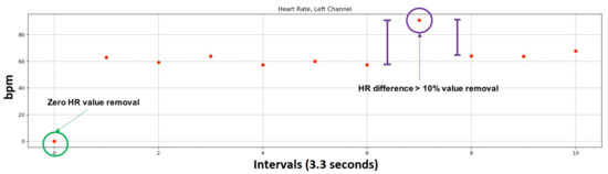 Furthermore, at times, the participants moved. This caused their face to be momentarily out of focus. This caused some atypical values, which were removed. Although the participants were asked to face the camera, some of them moved their faces, causing the ROIs to be undetected. Quet et al. [59] claim that the maximum fluctuation for individuals is <10 bpm. In consequence, for this study, the difference between successive intervals to identify irregular beats was set to 10%. The procedure to clean the HR-RAW vector compared each interval i with the average value of the two adjacent intervals: previous and following. If the interval i had an average value either greater than or less than 10% of both intervals, it was eliminated because it was considered an irregular value. The procedure was repeated for the new interval i.