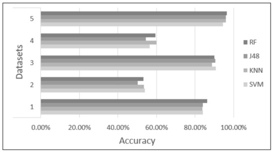 - Random forest (RF)—RFs are ensemble classifiers, which are used for classification and regression analysis of the data [52]. RF works by creating various decision trees in the training phase and output class labels those which have the majority vote [53]. There are three main parameters that must be configured, the number of trees to grow, seed, and tree depth. In this study, these parameters are set to 100, 1, and 0 (for unlimited), respectively.