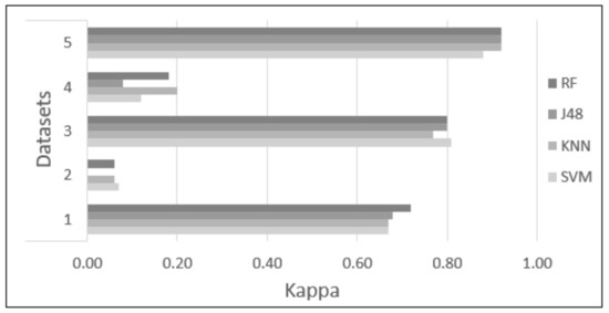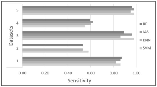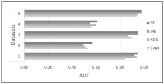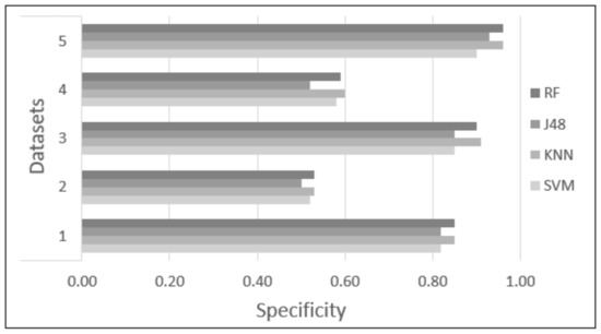 - J48 decision tree—J48 is an open-source Java implementation of the C4.5 algorithm, which is used to generate decision trees. This algorithm was developed by Ross-Quinlan [51], and it is often referred to as a statistical classifier. The main parameters are the confidence factor and the minimum number of instances per leaf. In this study, the confidence factor and the value of the minimum number of instances are set to 0.25 and 2.00, respectively.