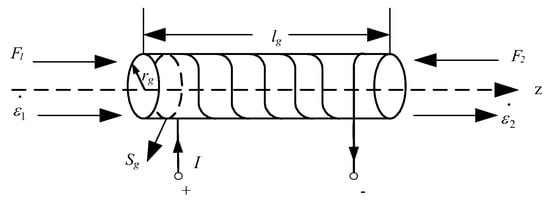 In Figure 3 and Figure 4, is the length of the Terfenol-D rod, I denotes the input current, V is the induced electromotive force generated in the loop, and F1 and F2 are the forces in the mechanical terminals. ε1 and ε2 are the vibration velocity at z = 0 and z = lg, respectively. L0 is the damped inductance and expressed as [23]