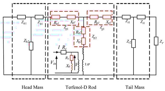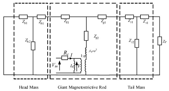 An equivalent circuit of the Tonpilz transducer without considering material losses is shown in Figure 5, where the subscripts r, h, g, and t are the radiation load, head mass, Terfenol-D rod, and tail mass, respectively. Zh1 and Zh2 denote the series and parallel impedances of the head mass, and Zt1 and Zt2, represent the series and parallel impedances of the tail mass. The detailed impedance expressions of the above components can be found in Table 2.