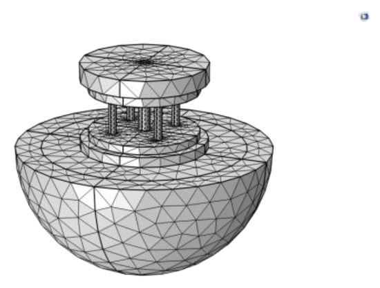 To verify the feasibility of using complex parameters to consider the material losses, this paper adopts the widely used FEM software COMSOL Multiphysics 5.5. The main components, such as the head, tail, and Terfenol-D, of the transducer are modeled, ignoring the effects of permanent magnets and disc springs, and transducer screws. In the simulation, meshing is one of the most important aspects to obtain accurate results, especially for wave generation. To accurately resolve sound pressure waves in inner water, this paper specifies the maximum grid cell size as 1/5 of the corresponding minimum wavelength, which is the speed of sound in water (1500 m/s) divided by the maximum frequency used in the frequency sweep. The perfectly matched layer (PML) is meshed using the sweep feature to create a five-layer-structured mesh. Additionally, a layer of “Boundary Layer Mesh” is created within the inner water adjacent to the outer field boundary, with a thickness set to 1/100 of the corresponding minimum wavelength. This boundary layer produces a smooth transition between the inner free tetrahedral mesh and the outer structured prismatic mesh elements, resulting in a higher accuracy of the external field calculation. The finite element model is shown in Figure 9.