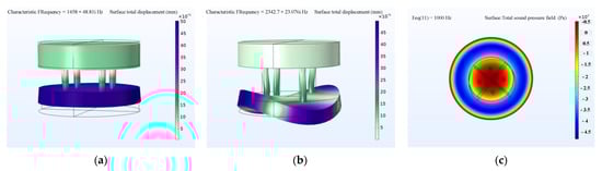A modal simulation was conducted; the longitudinal vibration mode frequency was 1458 Hz (as shown in Figure 10a), and the flexural mode frequency was 2343 Hz (as shown in Figure 10b). The longitudinal vibration mode was a piston mode, where the radiation head moved forward and backward together in the polarization direction. In the flexural mode, the corners of the radiating head moved in opposite directions to the center. This is the flexural mode of the head mass, which, in general, adversely affects transducer performance [6]. Here, we mainly discussed the simple longitudinal vibration mode to validate the modeling techniques using the complex material quantities. The sound pressure distribution of the transducer in the longitudinal vibration mode is shown in Figure 10c. The current response sent by the transducer in water can be calculated according to the far-field sound pressure value.