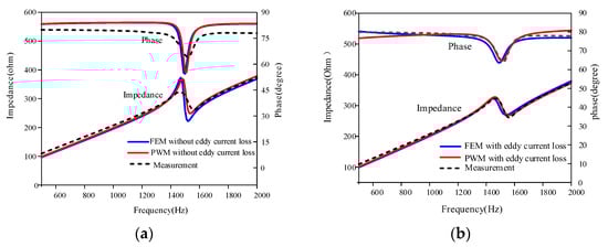 It can be seen in Figure 11a from the impedance spectrum that the improved PWM and FEM models considering the material losses (without eddy loss) roughly approach the measured impedance curve. There are still a few discrepancies in the phase curves across the wide frequency range. The PWM and FEM simulation results after further consideration of the eddy current loss (Figure 11b) produce more accurate results compared with the measured results. The eddy current loss is frequency-dependent and increases with the frequency, so the permeability should vary with the frequency. The eddy current factor was introduced to make the relative permeability in the model be frequency-dependent, so the frequency dependence of the eddy current loss can be considered. Therefore, the phase curves of both simulation models considering the frequency dependence of the eddy current losses are closer to the experimental measurements. Both results are in good agreement with the impedance and phase curves.