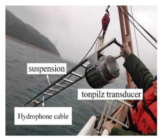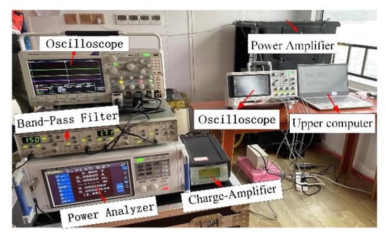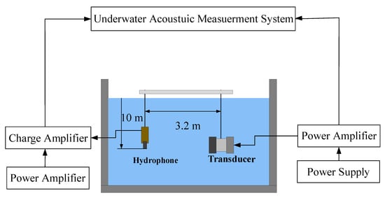 To yield better underwater measurement results, the experiment was carried out in a lake with a depth of 100 m and a minimum diameter of 2 km. The transducer was only deployed at a 10 m depth to ensure that the pre-stress stayed around 20 MPa in the lake, along with a standard hydrophone (B&K 8104) positioned 3.2 m away from the center of the radiating head of the transducer. A simplified schematic diagram of the transducer’s underwater test is shown in Figure 12. The experimental settings are shown in Figure 13 and Figure 14. The output voltages and currents of the power amplifier, the phase difference between them, and the hydrophone output voltage were measured and saved. The large-signal impedance and TCR were calculated.