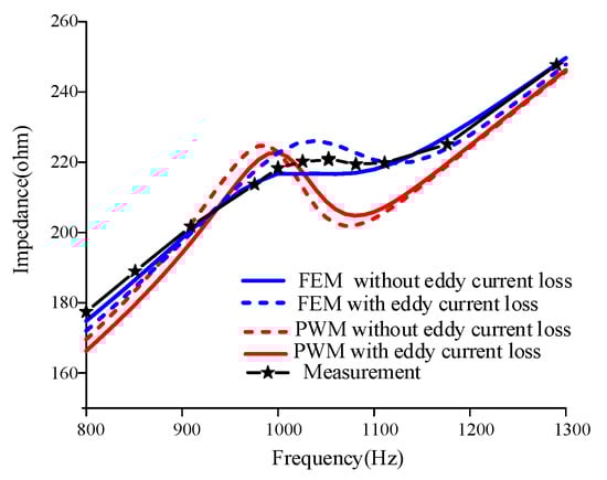 The simulated results of the improved PWM and FEM model and the impedance curves measured in the experiments are shown in Figure 15. It should be noted that the coil loss, measured with an impedance analyzer without the insertion of the Terfenol-D rods, was also taken into account by adding it to both simulated results. The frequency range was 800–1300 Hz. It can be seen from the impedance curve that, after considering the eddy current loss, the impedance amplitudes calculated using the PWM and FEM models are very close to the experimental measurement values. The impedance curve produced by the FEM simulation agrees well with the measurement.