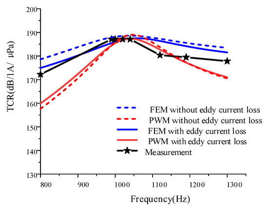 The simulation and measurement results of TCR are shown in Figure 16. It can be seen that the maximum TCR results of the improved PWM and FEM models established in this paper are close to the measured results, and the prediction accuracy is shown in Table 4. The prediction accuracy of the FEM model (with the eddy current loss) for the maximum TCR is 0.32%, and the prediction accuracy of the resonance point is 1%. This high prediction accuracy is very rare for the PWM of the transducer, which validates the proposed method of using the complex material parameters. Figure 16 also shows that the simulation results of the PWM and FEM models have a slight discrepancy. This may be attributed to the fact that the PWM model in this paper is a one-dimensional model, while FEM is a three-dimensional model. The discrepancies over the frequency range, except for at the resonance frequency, might result from the fluid simulation. FEM have better accuracies on the acoustic field. In the FEM simulation, a full sound absorption (no reflection) condition was applied at the outer boundary of the water medium. For the calculation of the TCR, a receiver node was set to read complex sound pressures at a distance approximately in a far field from the fluid–structure interaction layer.