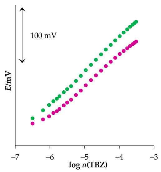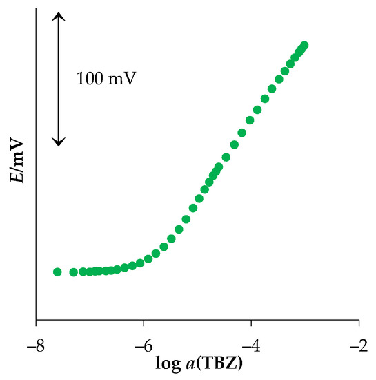 where E is electrode potential, E0 is standard electrode potential, S is the slope of the sensor, and is the activity of the TBZ cation. At 25 °C, the Nernstian slope for the TBZ cation amounts 59.2 mV/decade of activity.