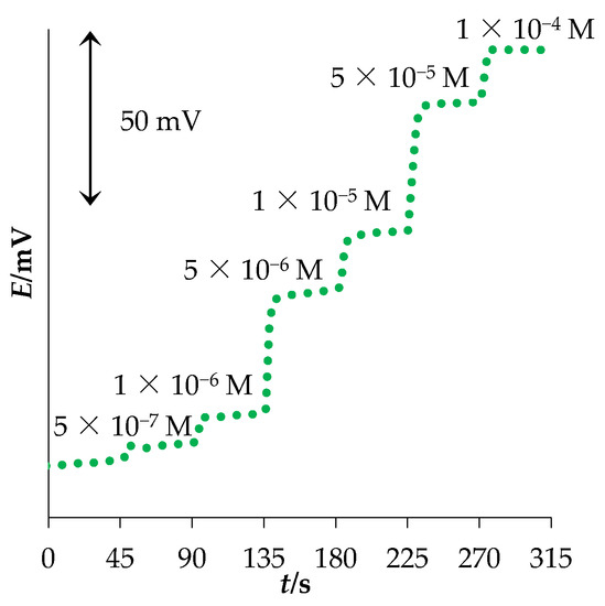 Dynamic response time is another sensor characteristic that is also important for its applicability for TBZ determination. It represents the time needed to attain 90% of the final potential value after a sudden change in TBZ concentration [35]. The response time measurements were performed by changing TBZ concentration every 45 s, in the range between 5.0 × 10−7 and 1.0 × 10−4 M. The resulting response is presented in Figure 3. It can be seen that the new MWCNT-OSO3−TBZ+ sensor has a fast response, with an average response time of 8 s.
