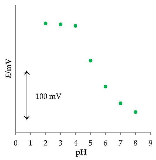 TBZ is slightly soluble in water. Its solubility increases in acidic media; thus, it was important to investigate the influence of pH on the sensor response. For that purpose, TBZ solution (c = 2.0 × 10−3 M) was used. The results are presented in Figure 4.