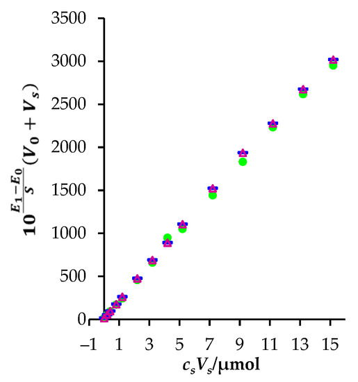 After constructing a plot of against , a linear graph is obtained. Its intercept is a negative value of the TBZ amount in the sample before standard additions. The concentration of TBZ in the analyte solution can be calculated by knowing the sample volume. Figure 5 presents the example of Gran plots obtained measuring TBZ concentration in aqueous samples of known concentration (c = 1.0 × 10−5 M, three repeated measurements).