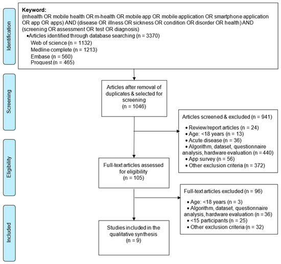 We illustrate the article selection process in Figure 1. We imported the citations (n = 3370) into the reference manager software EndNote and eliminated duplicates, which resulted in 1046 articles. We then retrieved the title and abstract of all papers (n = 1046) electronically, and we applied selection criteria to eliminate publications inconsistent (n = 941) with the objective of this review. Matching the study’s objectives, we examined the full texts of the remaining papers (n = 105) and selected nine papers (n = 9) for our study that reported an app-based disease-screening system for the adult population.