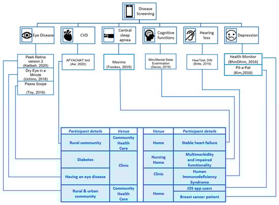 The medical conditions of the study participants varied across the studies. For example, the studies screening for eye disease, CVD, and depression recruited undiagnosed people from rural and urban communities [15,16,22]. In contrast, other studies enrolled participants living with chronic diseases, such as stable heart failure (HF) [17], multimorbidity and impaired functionalities [18], human immunodeficiency virus (HIV) [19], eye disease [20], diabetes [21], and breast cancer [23]. However, the magnitude of disease among the participants differed. A study amongst diabetic patients living with diabetes for 11.9 ± 8.4 years screened for diabetic eye disease [21]. Another study screening patients for dry eye disease (DED), a multifactorial disease characterised by unstable tear film, considered participants having an eye disease [20]. Other studies considered patients visiting clinics for their health and wellbeing, including HIV patients [19], breast cancer patients [23], and HF [17]. In another study, the app screened older adults residing in nursing homes for cognitive impairment [18].
