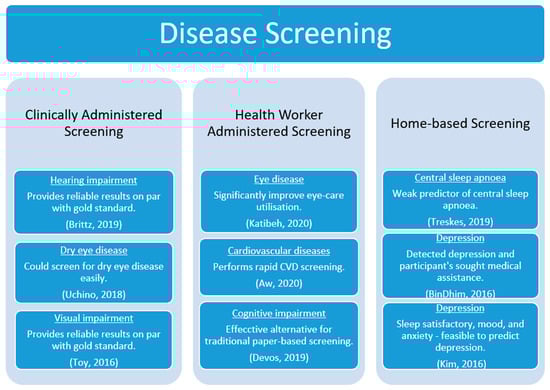 Screening aims to achieve early detection of the disease as part of primary prevention or effective treatment in people before the occurrence of the disease or any symptoms of the disease. The screening methodology varied between the studies. For example, screening for comorbidities, such as hearing and visual impairments, amongst HIV and diabetes patients visiting clinics, were performed [19,21]. People with eye disease visited the clinic to screen for DED [20]. Trained health workers visited homes and/or invited residents to community centres to screen for eye diseases and CVD [15,16]. Similarly, health workers caring for the elderly in a care home screened their residents for cognitive impairments [18]. Moreover, central sleep apnoea and depression screening was self-administered at the participant’s residence [17,22,23]. Accordingly, we have categorised the studies based on the screening methodology administered as clinically administered screening [19,20,21], health-worker-administered screening [15,16,18], and home-based screening [17,22,23]. Figure 3 represents the screening apps, the administered methodology, and significant outcomes.