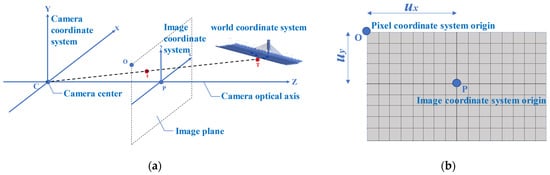 (a) Relationship among the camera coordinate system, the image coordinate system, and the world coordinate system; and (b) Relationship between the pixel coordinate system and the image coordinate system.