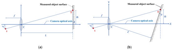 When the optical axis of the camera is not perpendicular to the surface of the measured object (as shown in Figure 3b), the included angle would affect the measurement accuracy []. Feng et al. [] studied the influence of different angles between the optical axis and the surface of the measured object on the accuracy, and found that S can be determined by: