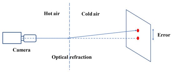 Refraction is a complex optical phenomenon occurring naturally, and vision sensors are easily affected by optical refraction at high temperature, so it is still a challenge to monitor a structure remotely using vision sensors. It can be observed that the change of air density caused by heating causes a change of optical refractive index, which leads to distortion of video images and thus error in displacement measurement. Optical refraction error caused by uneven heating of the air is shown in Figure 4. During a field test, when the air between the camera and the target structure was heated unevenly, measurement error increased as the measurement distance increased [].