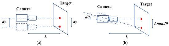 In addition to temperature change, the position of the camera will change due to various influencing factors (e.g., traffic load, thermal expansion and cold shrinkage of brackets, or loose structures). When measuring a real structure outdoors, the position and direction of the camera often change slightly due to wind, vibration and ground instability []. Ye et al. [] believed that the thermal expansion and cold contraction of the mounting bracket would also cause a small change in the position of the camera, and this small motion of the camera, even a very small rotation, would lead to a very large error with increasing range. Figure 5 is a vision-based monitoring system in which the target is fixed, and Figure 5a,b show the errors caused by camera translation and rotation, respectively. It can be seen that, when the camera translates a distance dy along the vertical optical axis, the error is dy; However, when the camera rotates slightly through an angle dθ, the error caused is L·tandθ, which is unacceptable. Therefore, in order to improve the accuracy of absolute displacement estimation, several camera motion subtraction techniques have been developed: (1) digital high-pass filtering (DHF) [,]; (2) background modification (BM) [,,]; (3) inertial measuring unit (IMU) []; and (4) ego-motion compensation (EC) [].