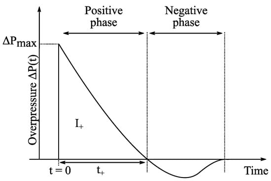 Main descriptors of this waveform (or signal) are the magnitude of the overpressure peak (), the positive pressure impulse (), and the positive phase duration (). The time of arrival of the blast wave will not be studied here and, consequently, the origin () indicates when the blast wave reaches the pressure sensor. Blast wave descriptors depend on the explosive type (e.g., C4, Semtex, TNT, etc.), the equivalent mass of TNT () of the explosive load and the scaled distance , where R is the separation distance between the center of the explosive load and the sensor.