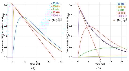 Consider two different Friedlander waveforms obtained respectively from large-scale and far-field (m/kg1/3) experiments, and a small-scale and near-field (0.3 m/kg1/3) experiment. Blast wave descriptors derived from K&B data are 15 kPa, 48 ms, and 310 kPa.ms (and 0.4) for the large-scale/far-field experiment, while 10 MPa, 100 µs, and 100 kPa.ms (and 9) for the small-scale/near-field experiment. These two Friedlander waveforms are applied to the input of first-order low-pass filters of different cut-off frequencies ranging from 50 Hz to 500 kHz. The waveforms at the filters output are displayed in Figure 2. It can be observed from Figure 2a that a sensor with the bandwidth of 50 kHz placed at the distance of 100 m from an explosive load with equivalent TNT mass of may be used to accurately estimate the magnitude of the overpressure peak. However, according to Figure 2b, this sensor provides a poor estimation accuracy of the peak magnitude when it is located at 15 cm from an explosive load with an equivalent TNT mass of 100 g. These simple examples illustrate that near field and small-scale experiments require a much larger sensor bandwidth than far field and large-scale experiments. In view of this result, it is not surprising that the magnitude estimation of overpressure peak in the near field and small-scale experiments reported in [,,,] is much less accurate than that obtained from the large scale and far field experiments presented in [,].