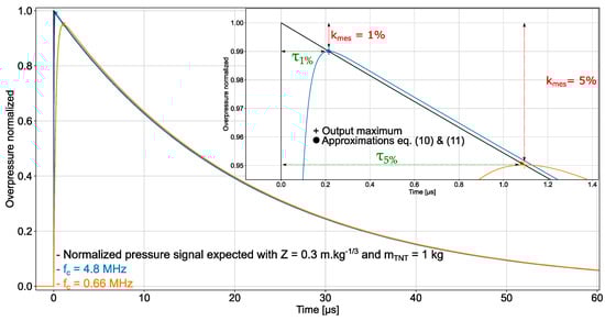 Friedlander waveform (derived from K&B data with = 0.3 m.kg−1/3 and = 1 kg, surface burst and side-on pressure measurement) applied to the input of two first-order low-pass filters with different cut-off frequency (4.8 MHz and 660 kHz) and waveforms delivered at the filters’ output. The ordinate is the ratio .