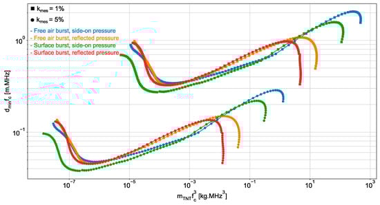 To keep the estimation accuracy unchanged, the smaller the equivalent mass of TNT explosive of the source of the blast wave, the wider the sensor bandwidth. In very large-scale experiments, sensors with narrow bandwidth can be used to estimate the overpressure peak with high accuracy, while broadband sensors are needed in very small-scale experiments. In other words, when an explosive load is too small, pressure sensors cannot be used to estimate the magnitude of the overpressure peak with a high accuracy of 5% or less, whatever the distance between the sensors and load. Conversely, when the load is very large, sensors can be placed at any distances from the load to accurately estimate the peak. For intermediate explosive load of equivalent TNT mass , there is a minimal distance between the sensor and load to estimate the overpressure peak magnitude with the desired estimation accuracy . As a matter of fact, according to Equation (16), if an estimation accuracy on the magnitude of the overpressure peak is required, then can be computed. As depends linearly on and, and vary with the scaled distance [,], the computed value of allows the derivation of , or equivalently , from the scaled distance. Consequently, at the given distance where the estimation accuracy must be achieved, can be derived from the value of . For illustration purpose, is displayed in Figure 5 as a function of for two estimation accuracies . We observe that, at the distance from a pressure sensor of fixed frequency bandwidth, if the estimation accuracy on the overpressure peak magnitude is 1% for an explosive load of equivalent mass of TNT, then the accuracy will be 5% for an equivalent TNT mass of .