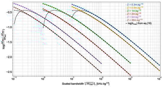 As illustrated in Figure 6, the estimation accuracy of the side-on overpressure magnitude can be conveniently displayed as a function of the scaled bandwidth for various scaled distances. It can be observed that the approximation provided by Equation (16) is in good agreement with the computed accuracy for up to 10%.