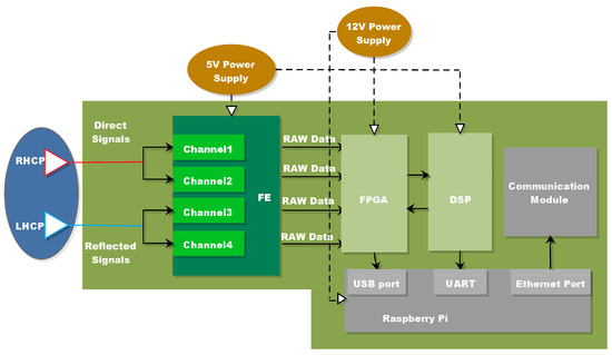 After the antennas, the RF front-end is the second step of the hardware platform. The MAX2769 RF chip, created by Maxim, is selected in the system after a thorough review of system performance, power consumption, cost, and other factors. With a total noise figure of less than 1.4 dB, the device employs an innovative low-power SiGe BiCMOS technology and includes a complete receiving connection within. Signal conditioning, RF down-conversion, filtering, and analog-to-digital conversion are all part of it. In the FE, the number of RF chains must be equal to the number of different signals. The four processing chains of the RF are used here. For the direct signal, two RF chains are used and coupled to the zenith-pointing antenna. The other two RF chains, on the other hand, are dedicated to the two LHC-polarized reflected signals and are connected to the nadir-pointing antenna’s two ports. The sampling frequency (16.369 MHz) produces a 2-bit quantized signal for Beidou and GPS system. A series of pin connections connects the RF front end to the backplane of the baseband processor module. On all four chains, the same clock reference must be used. Furthermore, the FE comes with a single 24 MHz TCXO reference. The onboard hardware is linked in Figure 2 as follows: the direct signal is supplied to Channels 1 and 3 in the FE as a reference, while the LHCP antennas are attached to the other channels. Furthermore, the raw data is transferred to the FPGA and DSP stages (described below) for further signal processing.