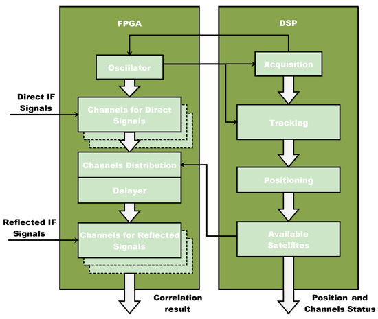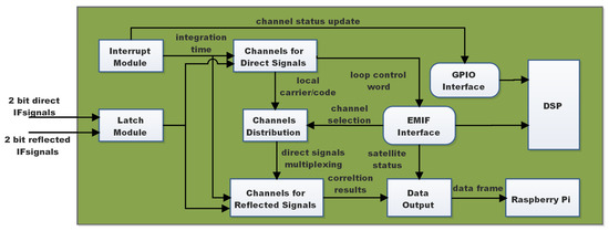 FPGA creates carriers and codes of various frequencies using digitally controlled oscillators and achieves the correlation operation of direct and reflected signals under the operation of DSP. DSP completes direct signal acquisition and loop judgment, controls FPGA synthesis of local carrier and PRN code, extracts positioning messages, and configures reflection channels. A total of 30 direct channels and 12 reflection channels have been created, allowing the satellite to be acquired and tracked while simultaneously processing the reflected signals. The direct and reflection channels are dynamically assigned, and the direct correlation result is given to DSP to help complete the tracking loop. The result of the reflection correlation is combined with satellite status information and sent to the Raspberry Pi via USB. Vivado Environment is used to write, test, and upload the application that runs on the FPGA. Furthermore, C++ with Code Composer Studio (CCS) completes the DSP application (Version 5.3). Direct signal processing and reflected signal processing are two of the key tasks of the multi-channel dedicated correlator based on FPGA. Figure 3 depicts the basic block diagram of the system.