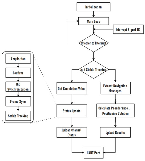 As shown in Figure 4, DSP is the other step of the baseband processing module and is responsible for real-time processing of digital signals. It is ideal for creating complicated logic algorithms and system control due to its command system. DSP may build a closed signal tracking loop with FPGA in the baseband processing module, allowing it to acquire and track the direct signal while also controlling the distribution of the reflection channel. For direct signal processing, DSP uses the interrupt response method. With a 1s interval, the FPGA emits the Task Interrupt Control (TIC). When the TIC comes, DSP exits the main program’s waiting loop and executes the response program. The interrupt response software conducts two branches of status update and positioning solution, depending on the difference in the present condition of the channel.