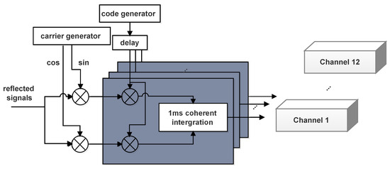 The reflection channel’s job is to carrier strip the reflected intermediate frequency signal, construct a time-delayed PRN code, and calculate the correlation value of the reflected signal with various time delays. Unlike the direct channel, the reflection channel lacks a local carrier and code generating module. To achieve signal multiplexing, it introduces the carrier and code created in the appropriate direct channel through dynamic distribution. The Doppler frequency shift between the reflected and direct signals may be ignored because the system is designed for shore-based applications. Through the frequency multiplier, the reflection channel acquires the chip delay control clock and 20 channels of time delay PRN codes at an interval of 0.25 chips and a range of −2 to 3 chips. For retrieval, the delay range and resolution are suitable. Each branch follows the same correlation procedure as the direct channel, resulting in a total of 20 delay correlation values and a correlation duration of 1ms. The structure of the reflection channels is shown in Figure 6.