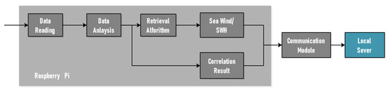 The retrieval unit, which contains a Raspberry Pi and a communication module, is the last component of the hardware platform. A desktop computer or an industrial computer is typically utilized for retrieval in the design of a typical system for sea condition monitoring. Although this method has a fast computation speed, it is expensive and consumes a lot of power in real applications, and it is restricted by size and power supply. To address the aforementioned flaws, the system employs Raspberry Pi as a stand-in for an industrial computer to perform the retrieval function of sea wind and waves. A Linux system may be installed on the Raspberry Pi, which has the advantages of compact size and low power consumption, making it ideal for long-term field observation. The retrieval unit is a Raspberry Pi 3B with a 1.2 GHz processor, four high-speed USB ports, Ethernet connections, HDMI connectors, and other features. The Raspberry Pi’s internal storage space is a 64 GB memory card, and the system’s overall performance matches the criteria. The process is depicted in the diagram below (Figure 7).